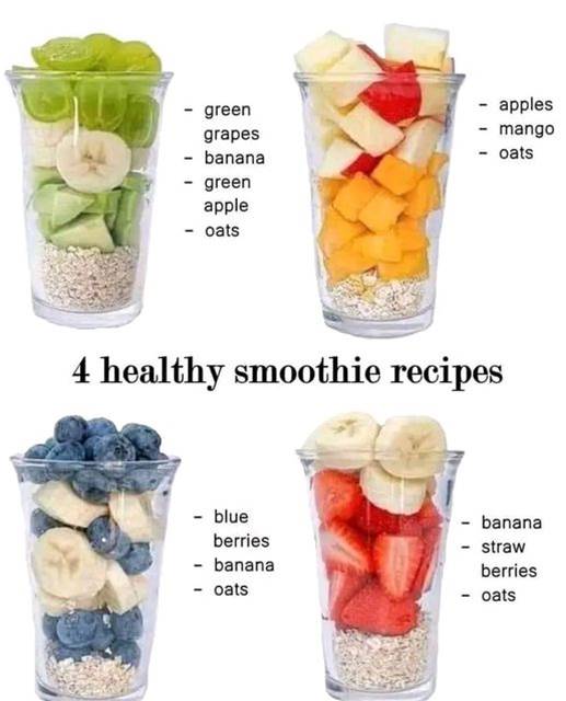 1 cup oatsgreen grapesapplesmangobananaoatsgreen appleoats4 healthy smoothie recipesbluebananaberriesstrawbananaberriesoatsoats